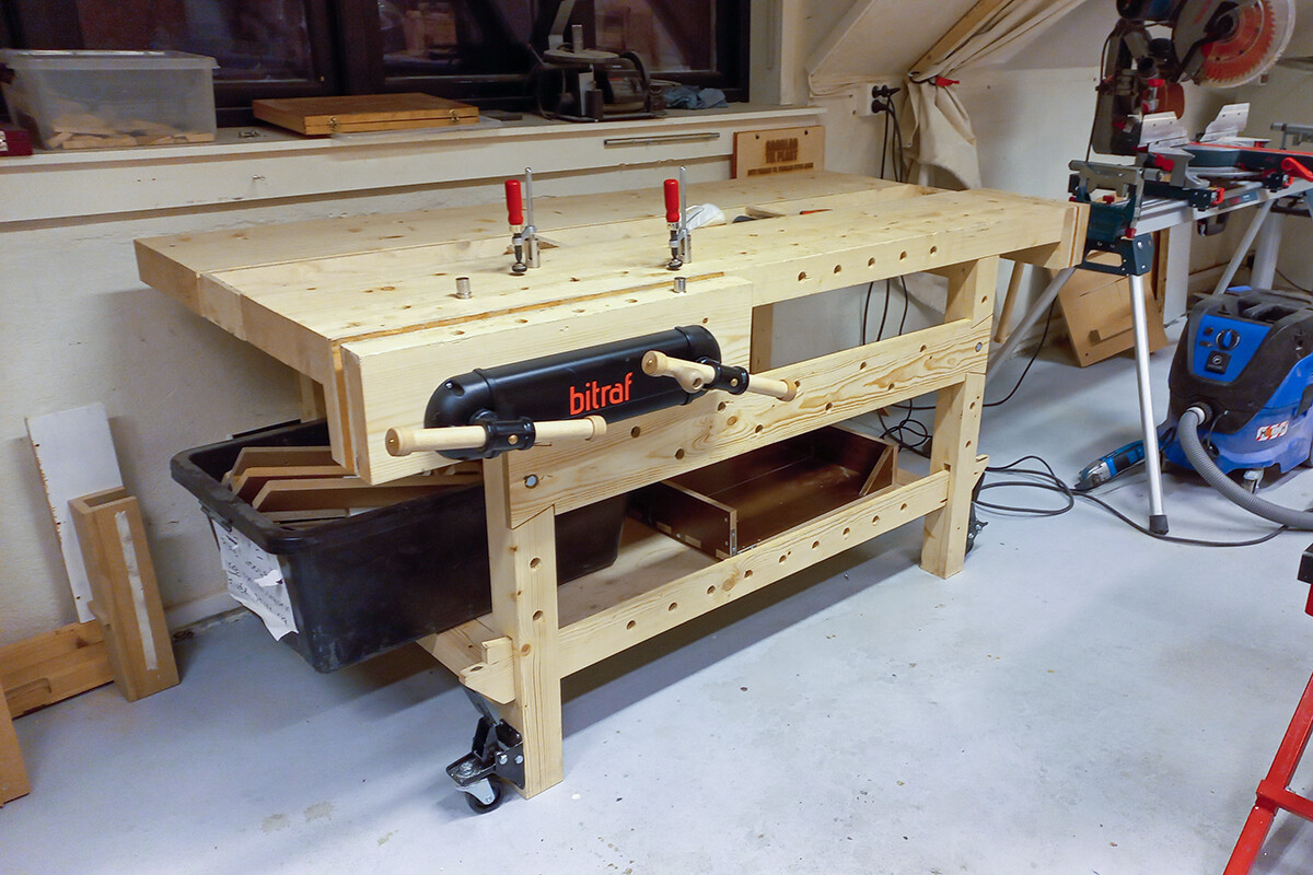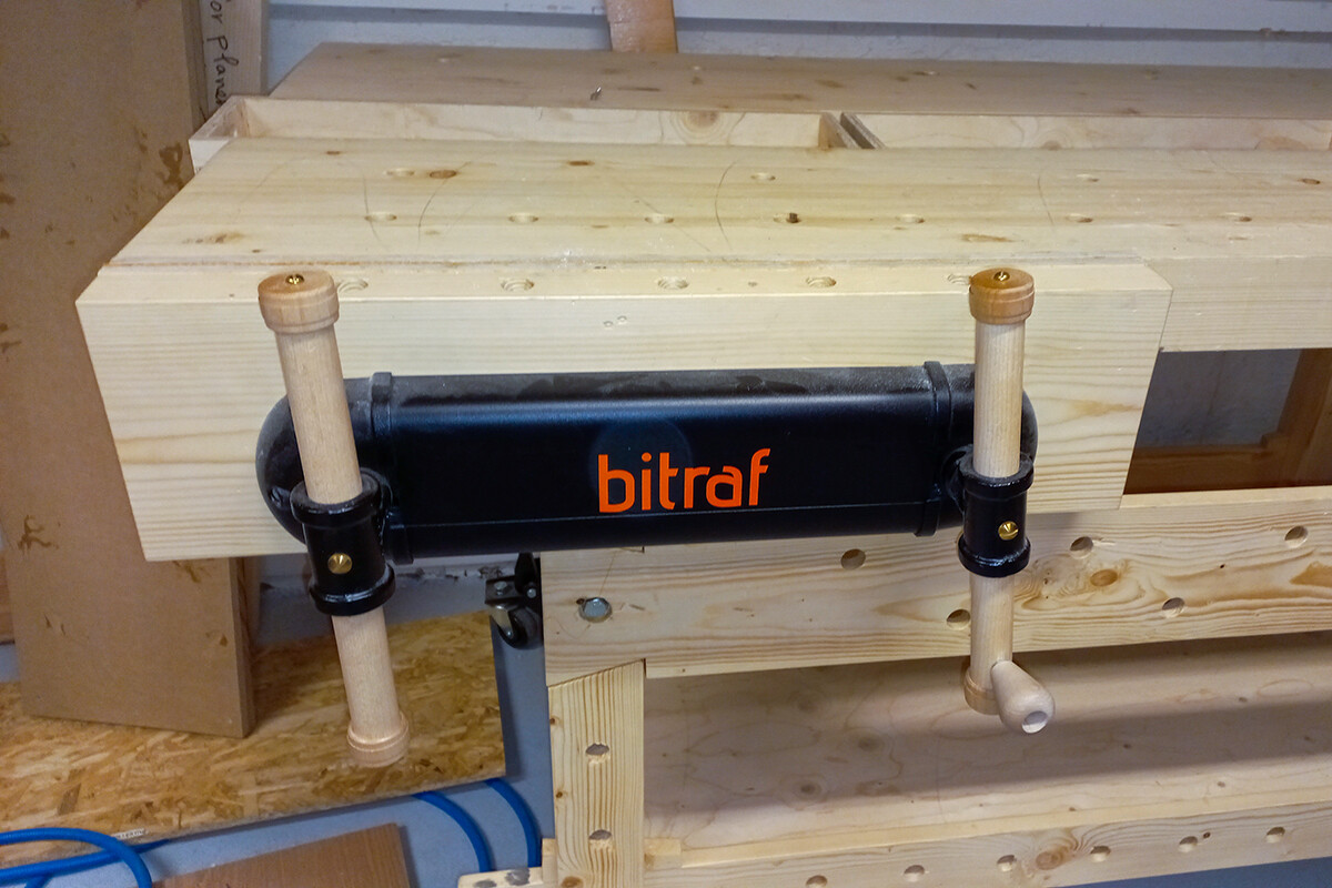 I designed and fabricated this robust workbench to serve the members of Bitraf, a makerspace in Oslo. Built for versatility and durability, the bench includes a heavy-duty twin-screw face vise and a quick release tail vice, and a comprehensive grid of dog holes for complex work-holding. I mounted the frame on locking casters to ensure the workspace remains modular and movable within the shop.