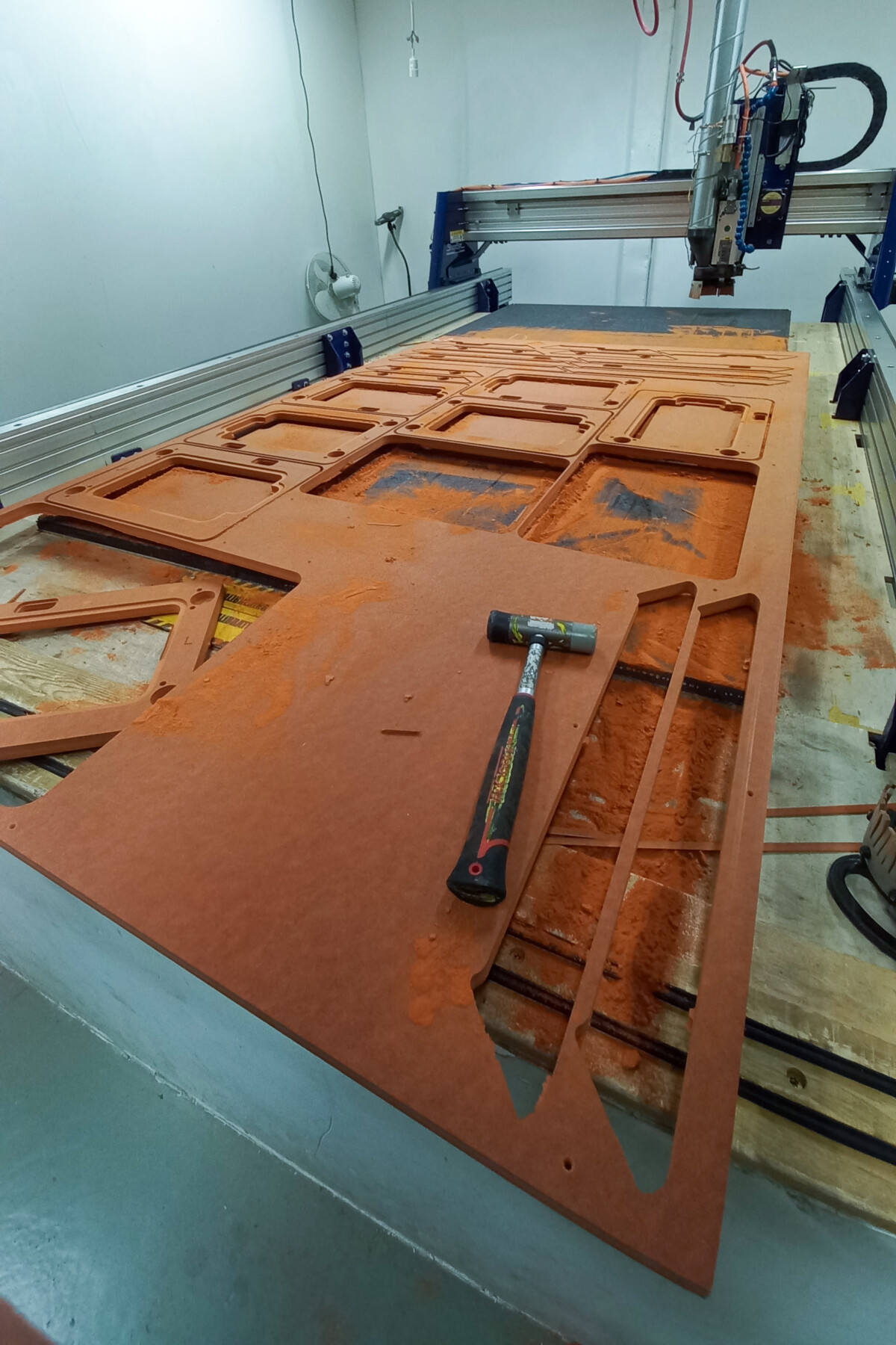 To solve the issue of unauthorized machine usage, I made this storage system. Starting with basic IKEA Metod units as the chassis, I used a large-format CNC router to manufacture custom doors from colored MDF. The cabinet features individual locking compartments with status indicator lights to manage the dispensing of activation keys.